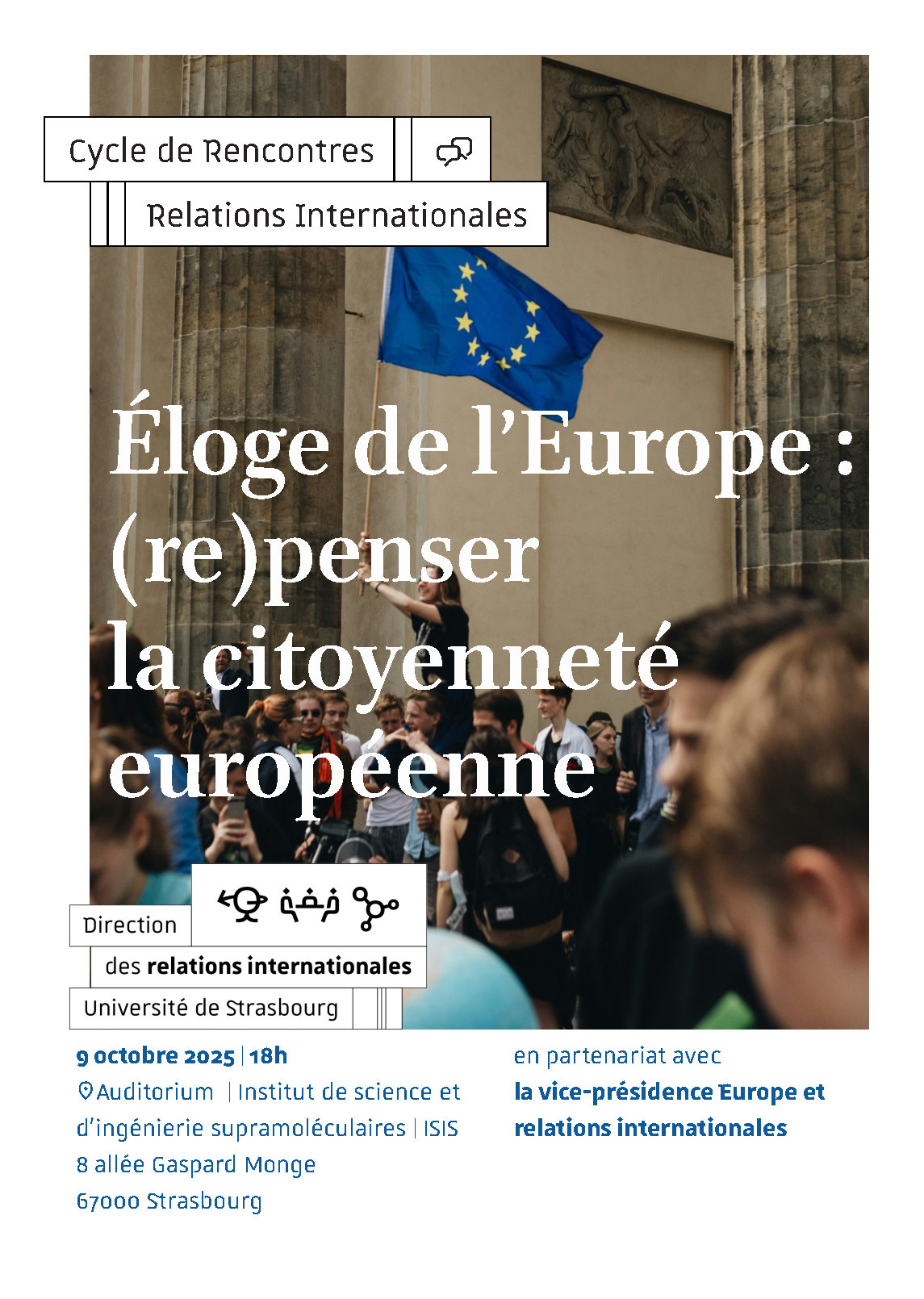 Dans le cadre de son nouveau Cycle de Rencontres Relations Internationales, la Direction des relations internationales et la vice-présidence Europe et relations internationales de l’Université de Strasbourg, vous invitent à une table-ronde intitulée « Éloge de l'Europe : (re)penser la citoyenneté européenne », jeudi 9 octobre, à 18h, dans l’auditorium de l’Institut de science et d'ingénierie supramoléculaires (ISIS).