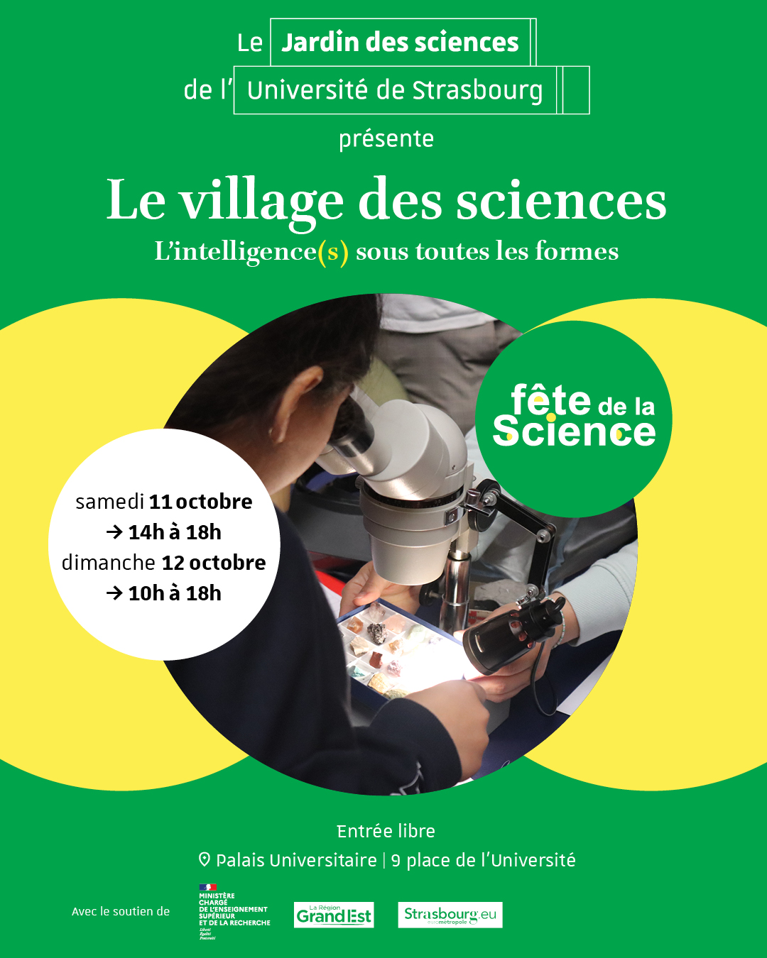 Le Jardin des sciences métamorphose le palais universitaire en « Village des sciences », avec la présence de plus de vingt-trois stands. C’est un événement incontournable de la Fête de la science qui réunit 25 laboratoires de l’Université de Strasbourg et du CNRS, structures culturelles et associatives. En lien avec la thématique nationale « Intelligence(s) », des scientifiques passionnés sont prêts à échanger avec les visiteurs pour leur faire découvrir les neurosciences, l’intelligence artificielle mais aussi des sujets autour de l’environnement, des géosciences, des virus végétaux ou sur la santé des sols urbains.