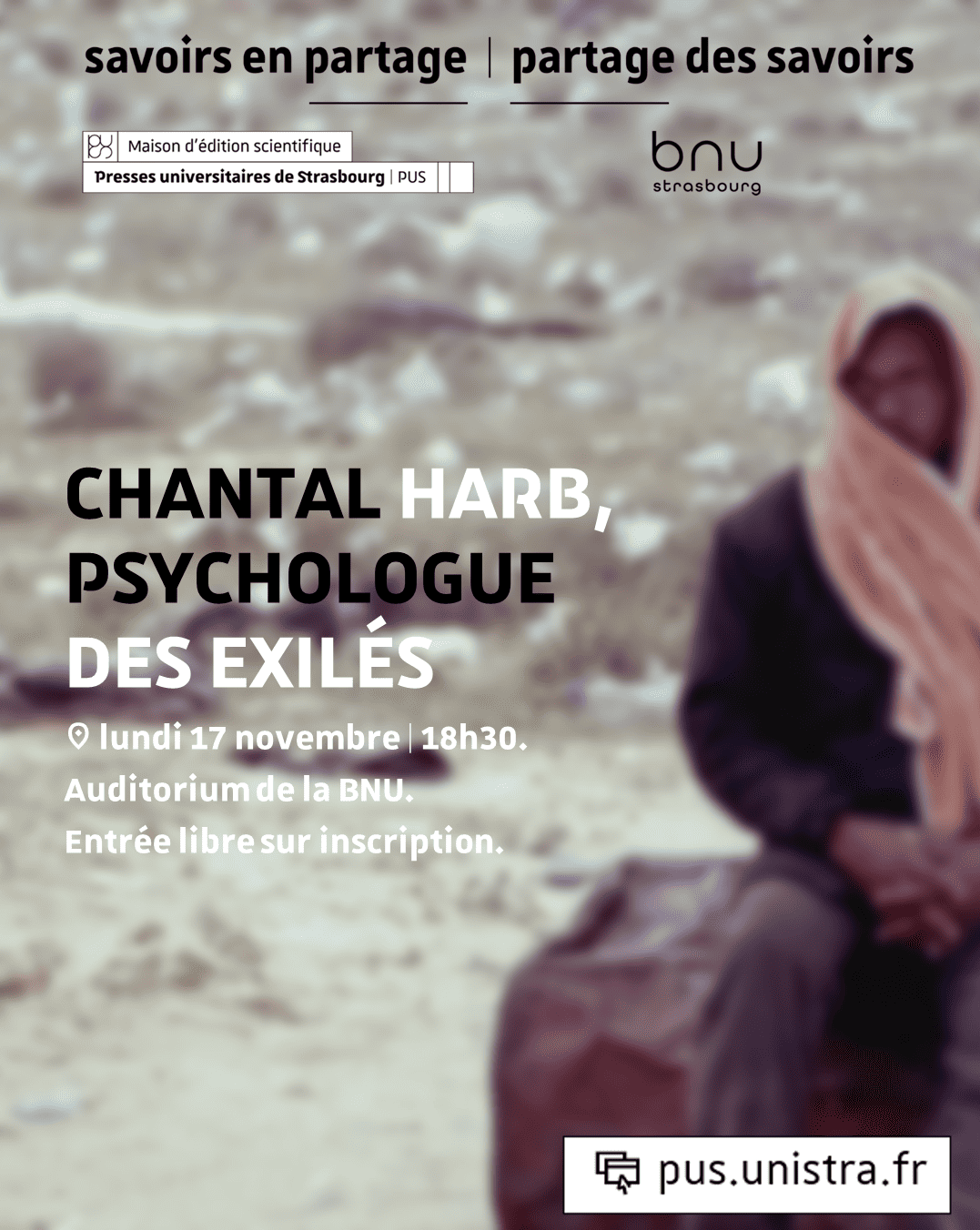 À l’occasion de la parution de son ouvrage dans la collection « Famille, psyché, société » des Presses universitaires de Strasbourg (PUS), la psychologue Chantal Harb évoquera son expérience - et les enseignements qu’elle en a tirés - au sein d’une association humanitaire venant en aide aux personnes en situation d’exil et de précarité.