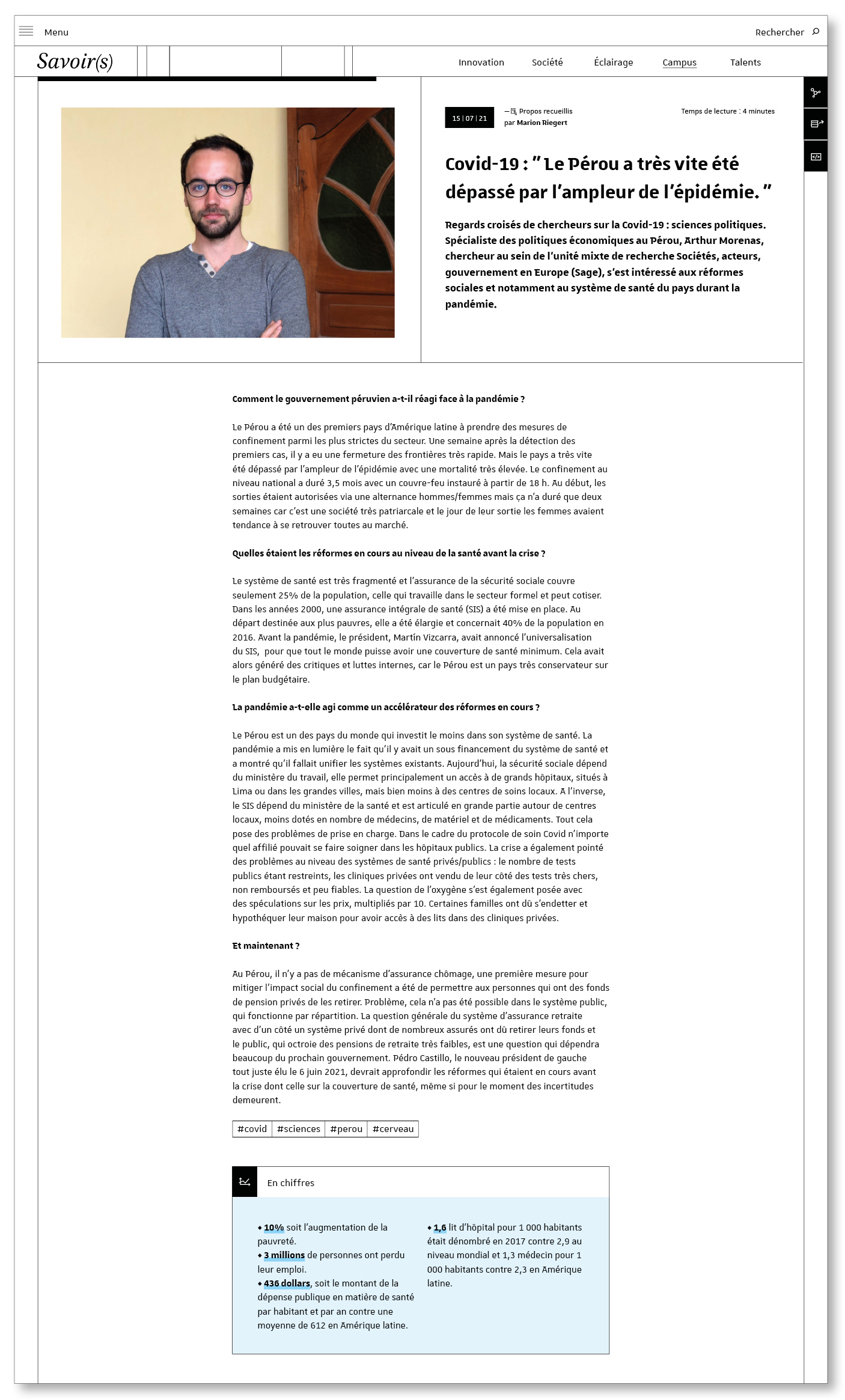 - Société : sujets sciences, société et économie liés à la recherche ou à des initiatives de terrain en lien avec des problématiques actuelles.